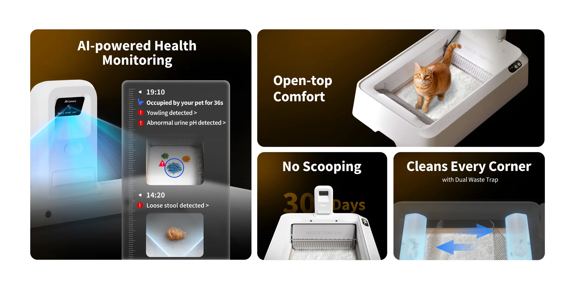 Yowling while using the litter box may signal urinary tract diseases or physical discomfort. Once yowling during usage is detected by the AI camera, it will trigger alerts via the PETKIT app.