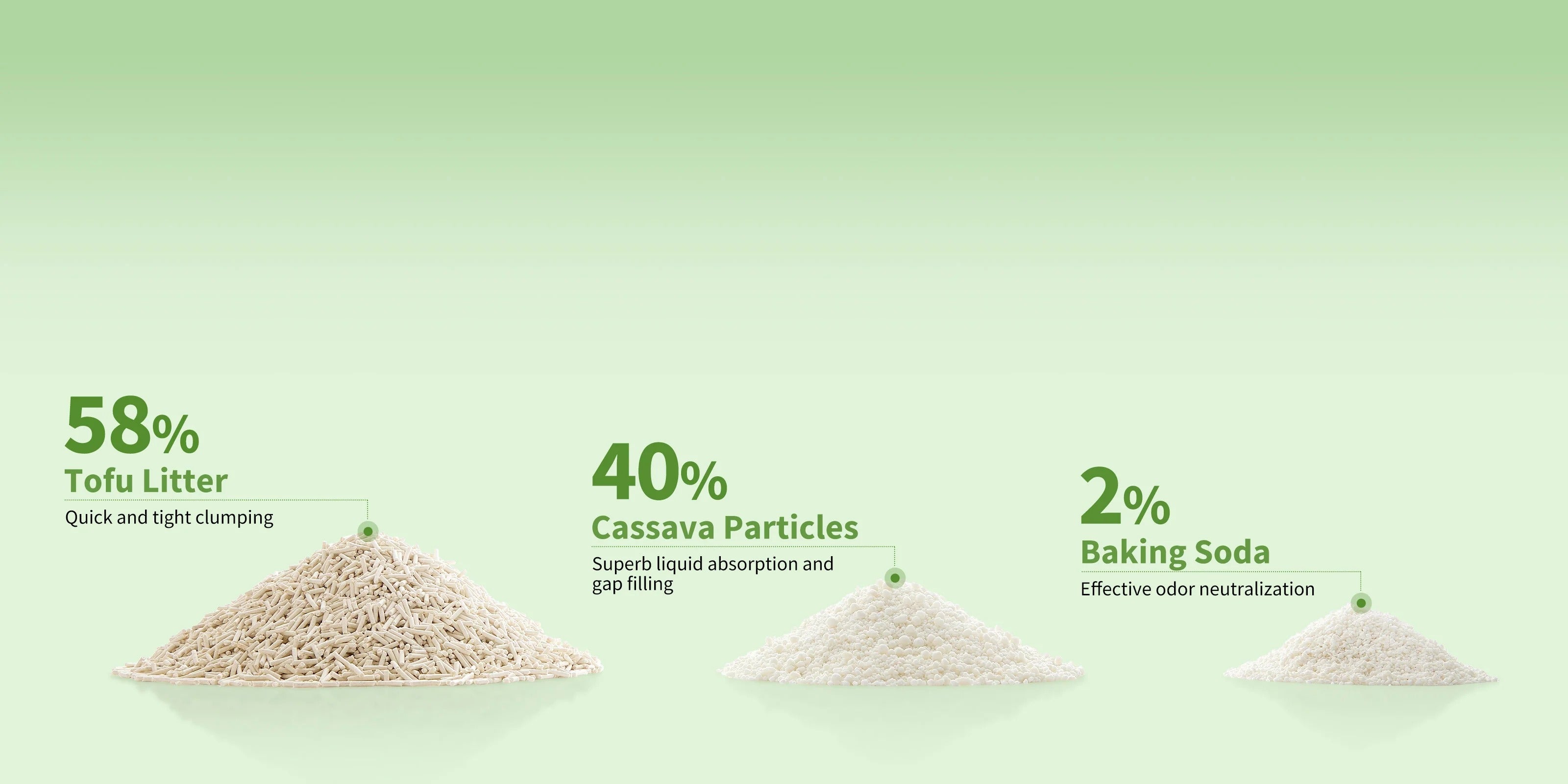 The large granules of cassava particles (1-4 mm) and tofu litter (7-13 mm) reduce adherence to your cat's paws, minimizing litter tracking and keeping the floor clean.