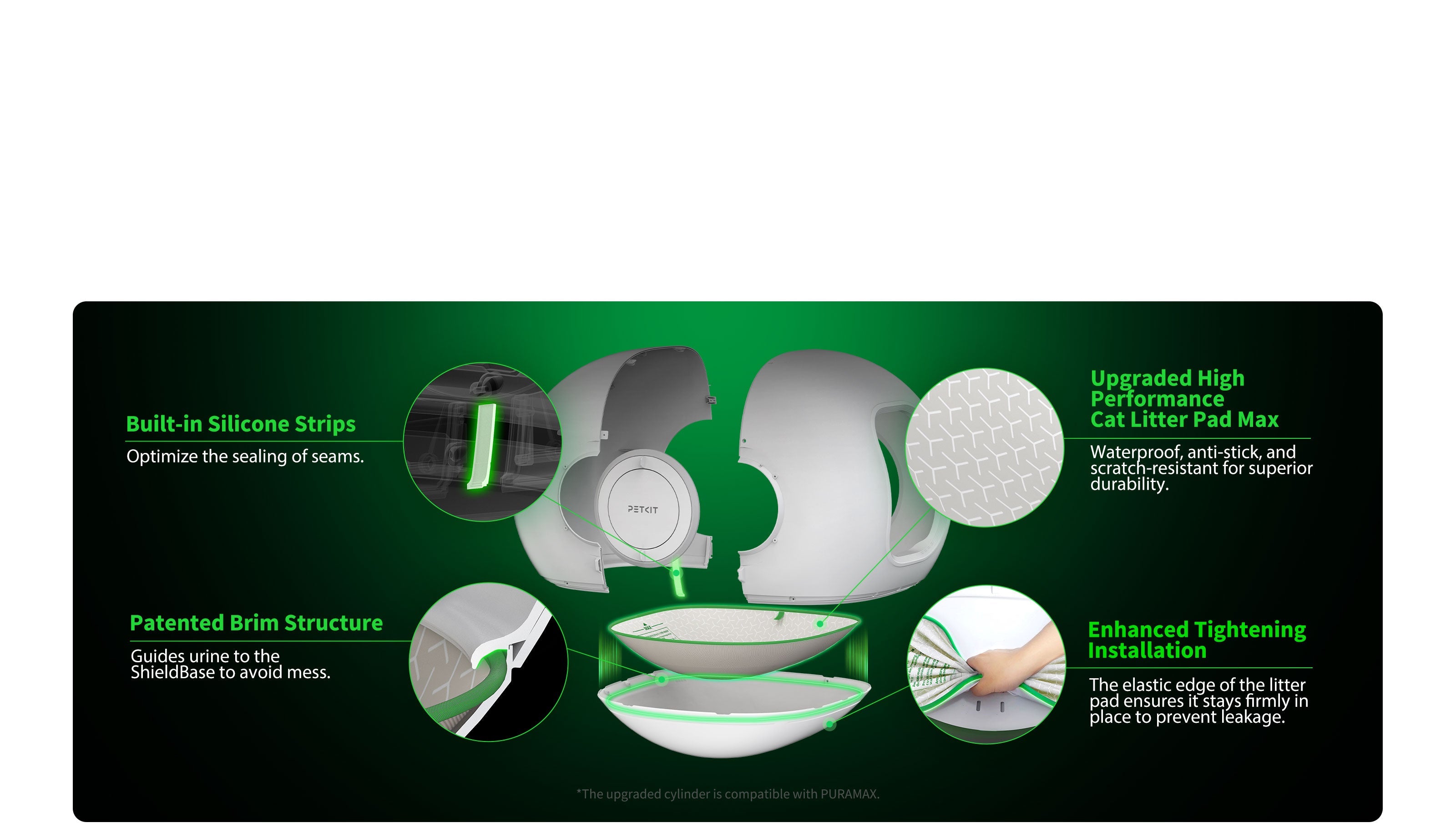 PURAMAX 2 definiert effiziente Pflege neu und sorgt mit einem verbesserten, versiegelten Zylinder für Auslaufsicherheit. Der geräumige Innenraum, die fortschrittliche dreifache Desodorierung und die innovative xSecure-Struktur sorgen für ein hygienisches und sicheres Katzenklo-Erlebnis.