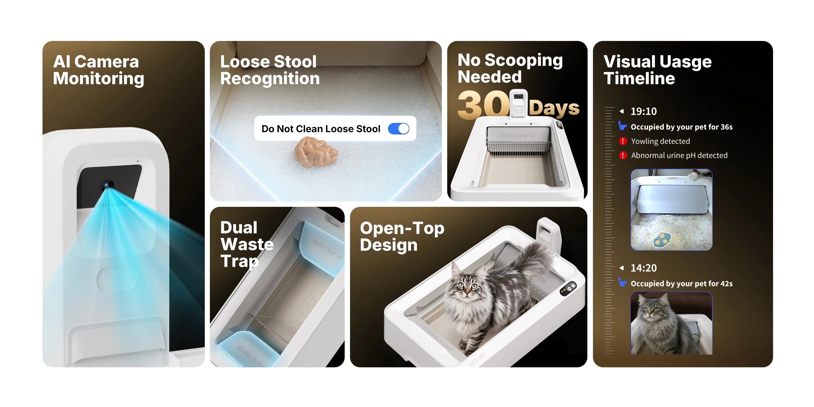 Yowling while using the litter box may signal urinary tract diseases or physical discomfort. Once yowling during usage is detected by the AI camera, it will trigger alerts via the PETKIT app.