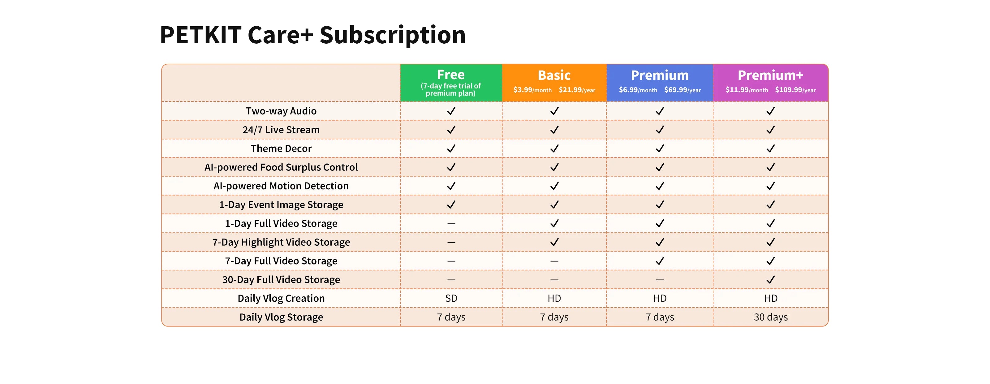 Wenn das Gerät zum ersten Mal mit der PETKIT-App verknüpft wird, können Sie die Videoaufnahmen des Vortages 7 Tage lang kostenlos testen. Nach Ablauf der Testphase ist für die weitere Videowiedergabe ein Abonnement von PETKIT Care+ erforderlich. Sie können je nach Bedarf aus verschiedenen PETKIT Care+-Abonnements wählen.