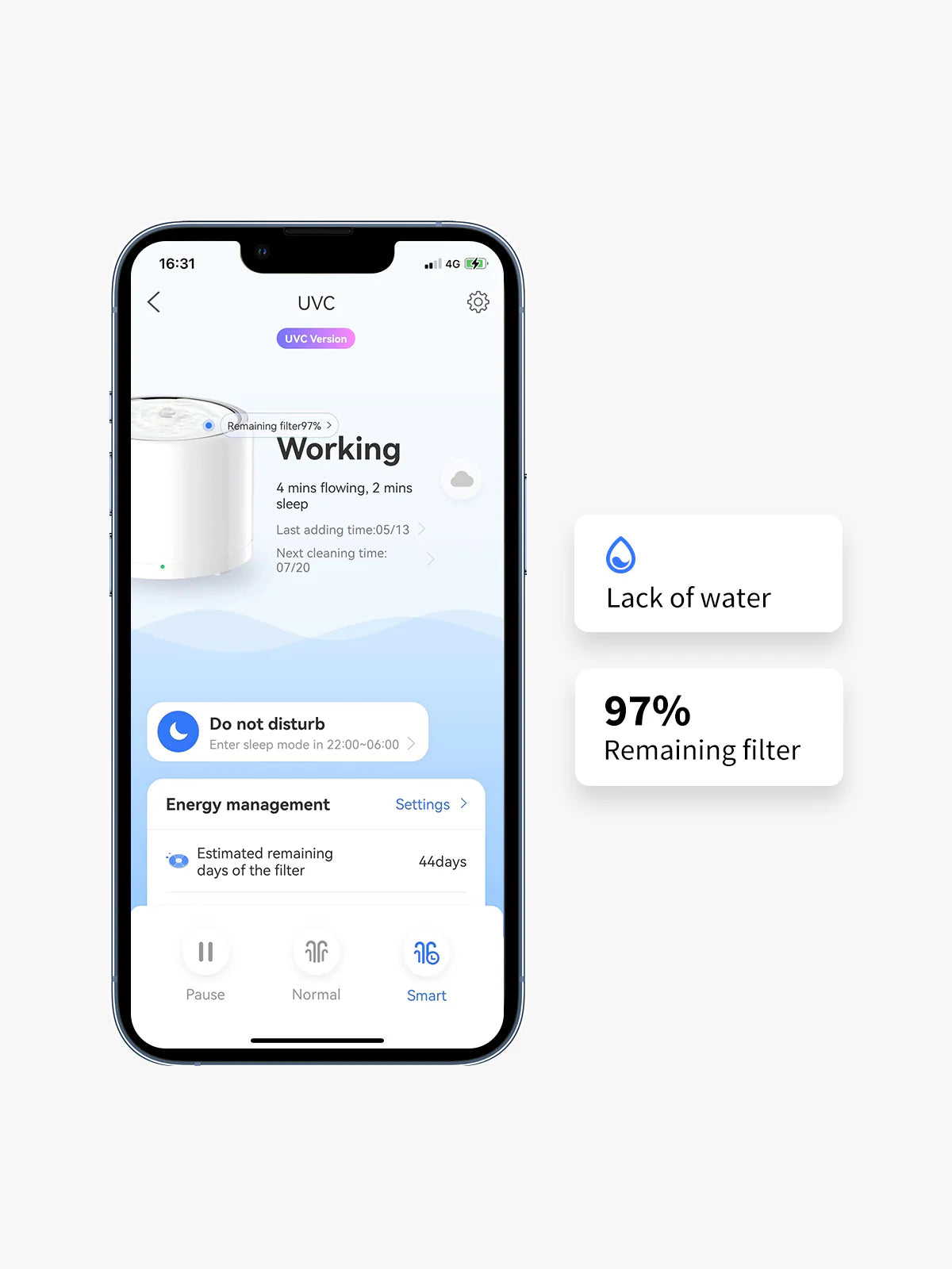 Avec une grande capacité de 1,35 L, l'appareil peut fournir de l'eau fraîche à 1 à 2 chats pendant 5 à 7 jours. La consommation d'eau quotidienne de chaque animal étant différente, la fréquence de remplissage varie.