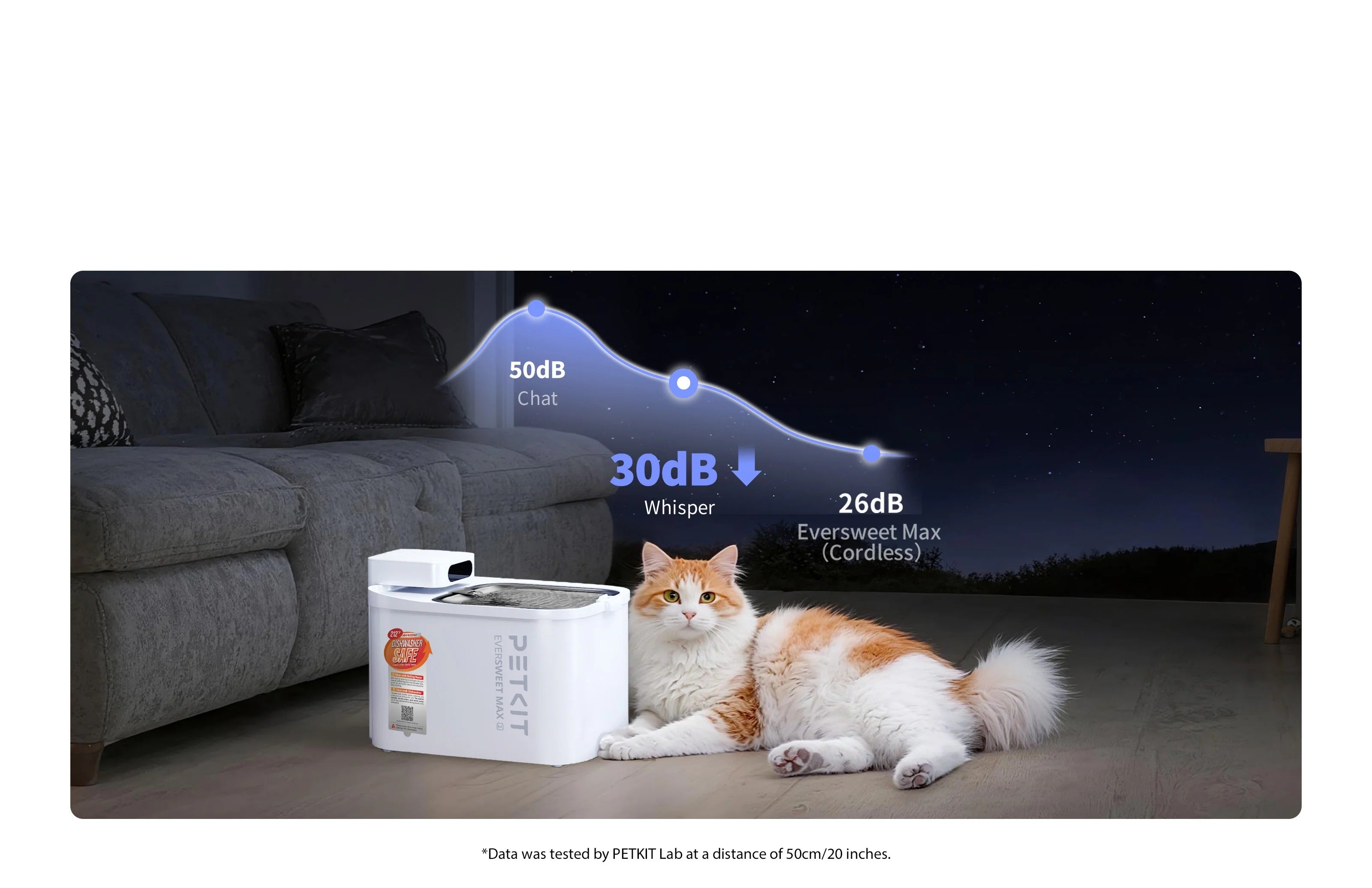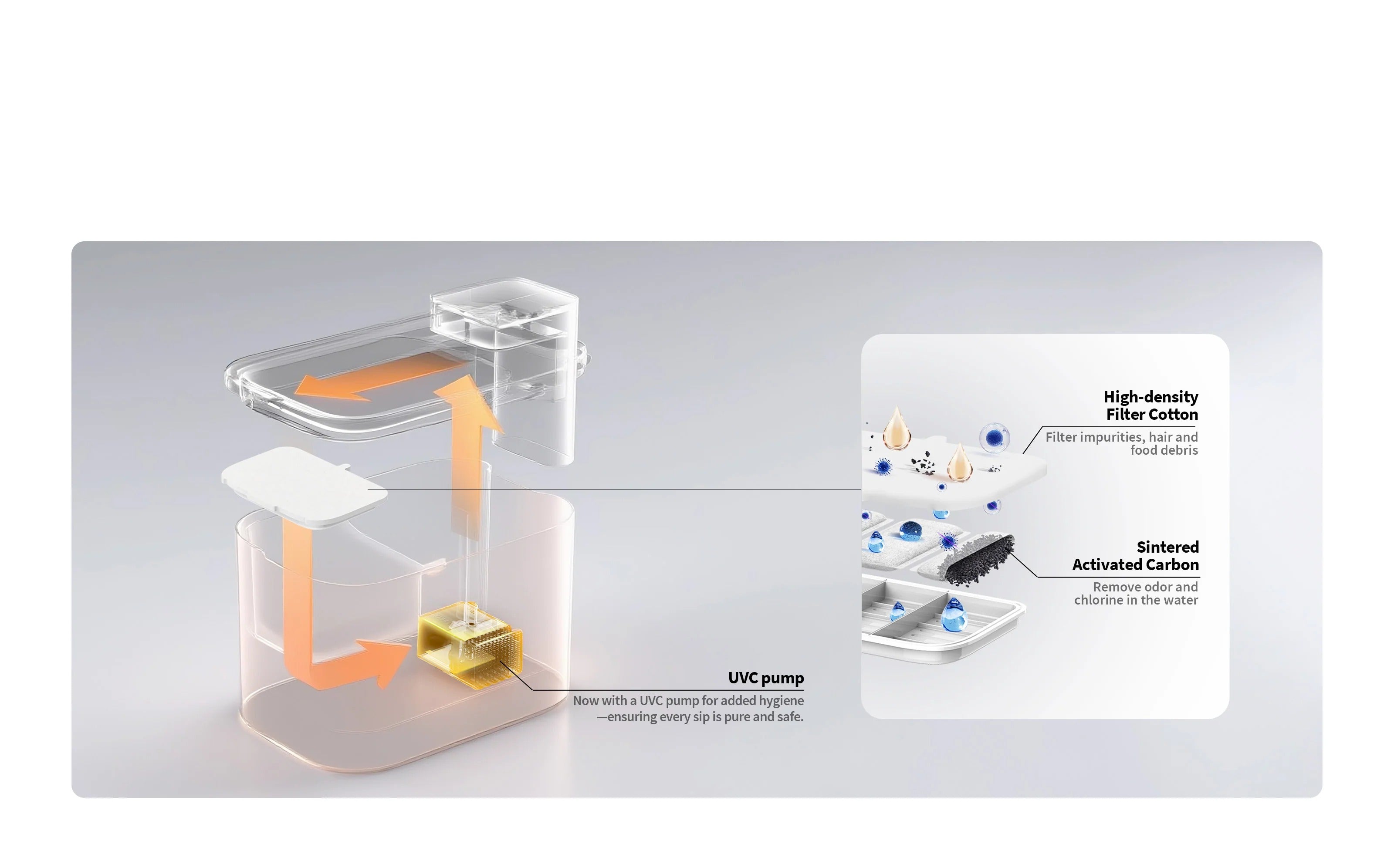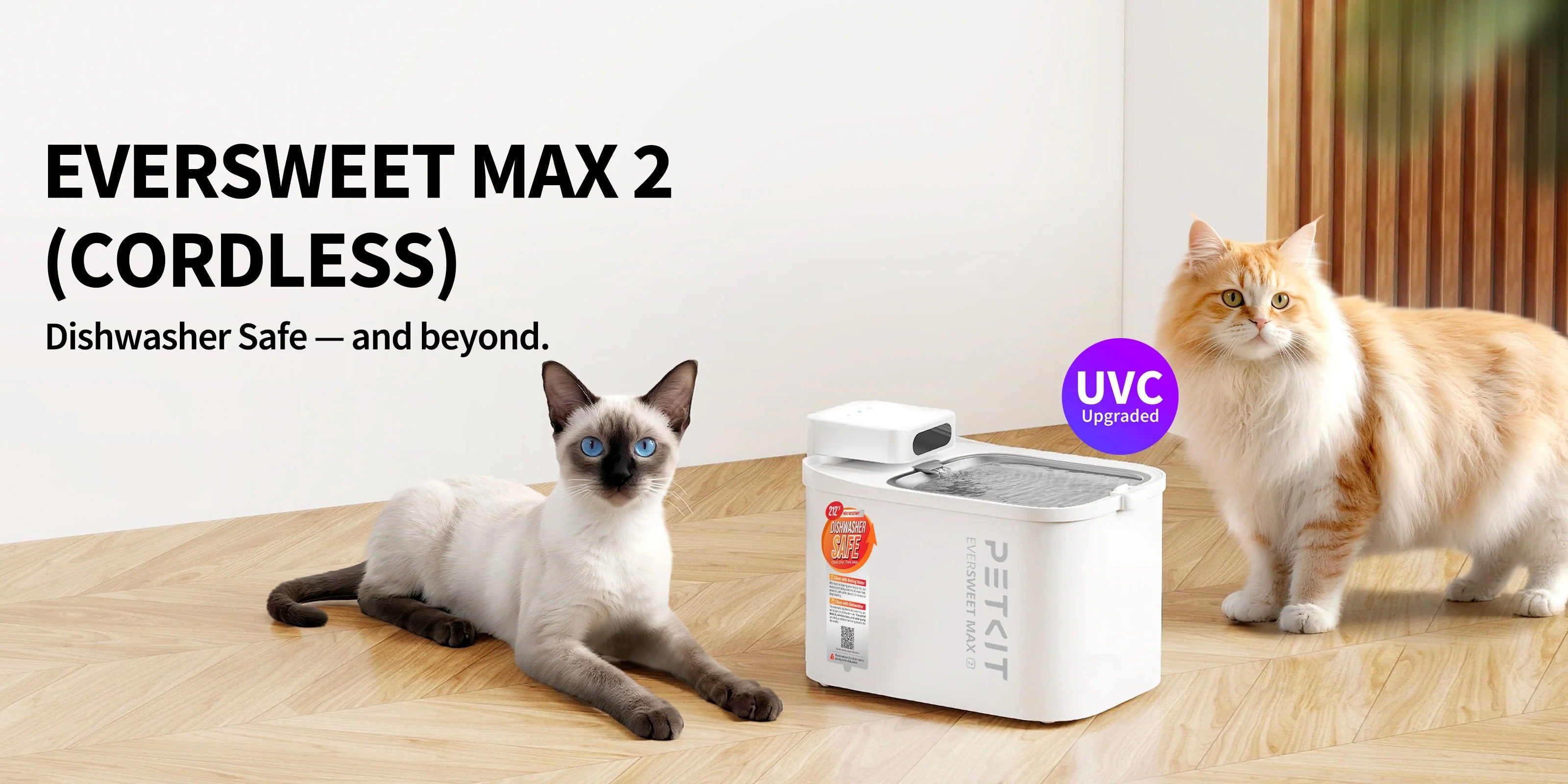 EVERSWEET MAX 2 (CORDLESS/UVC) PET WATER FOUNTAIN is equipped with a wireless UVC pump that eliminates exposed wires and helps reduce bacterial buildup for safer hydration. Built with dishwasher-safe, heat-resistant materials and a stainless steel tray that resists biofilm, it’s durable and easy to maintain. With three drinking modes, App monitoring, and 83 days of cordless battery life, it delivers clean, convenient, and reliable hydration for pets.