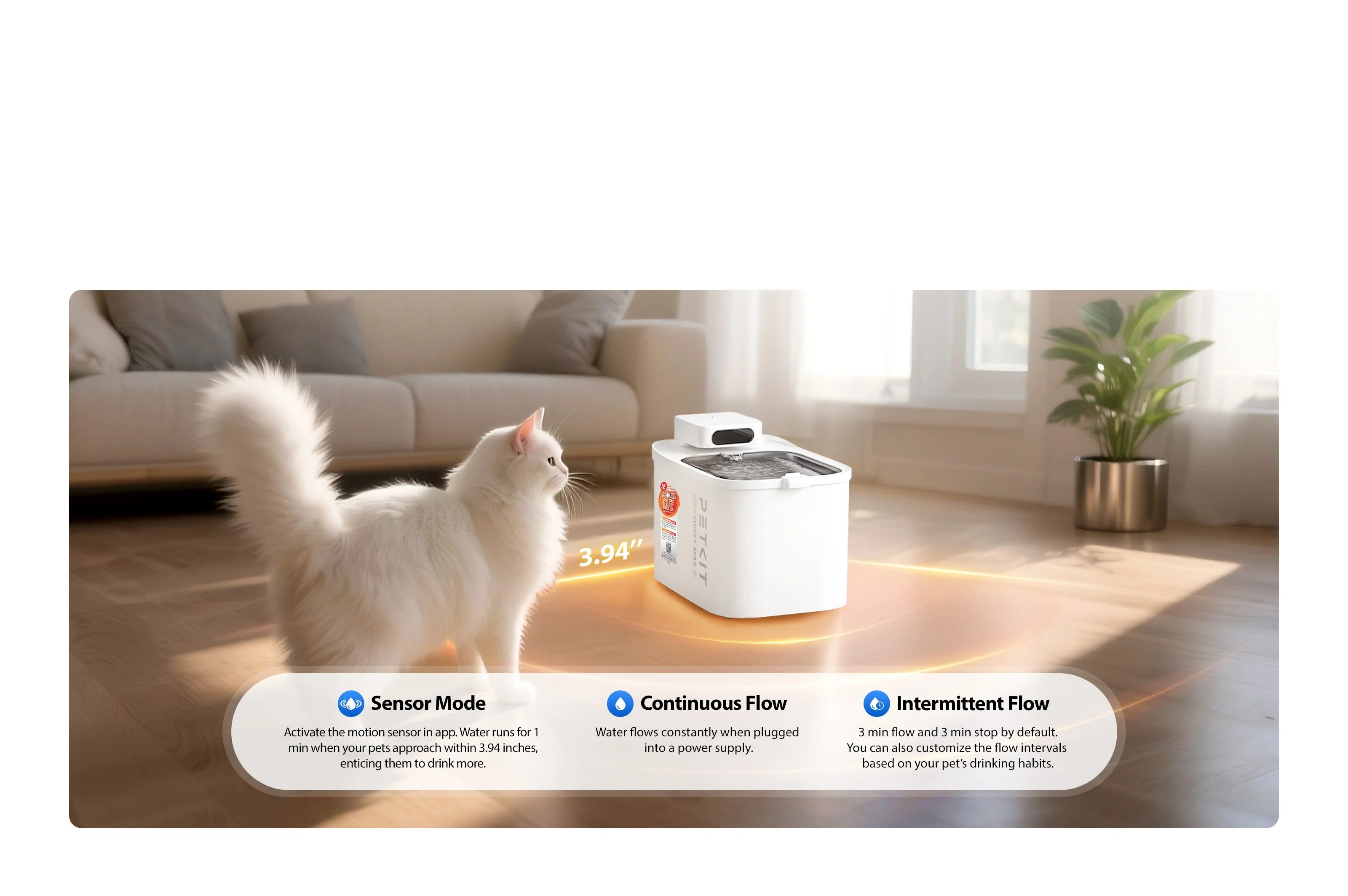 Place the water fountain where your pet currently drinks, keep the water flowing to entice your pet, and give timely rewards once your pet gets used to it. Be patient, as sensitive pets may need time to transition from their usual drinking bowl.