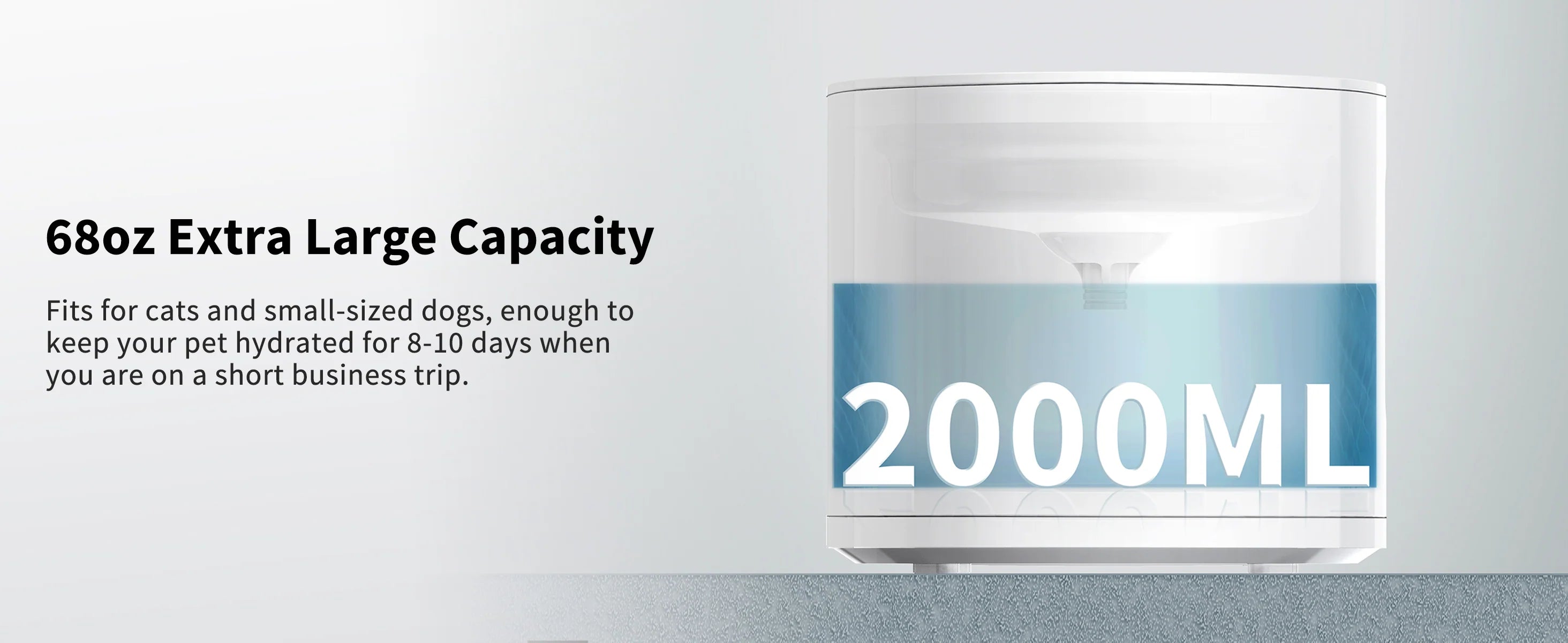 Avec une grande capacité de 2 L, l'appareil peut fournir de l'eau fraîche à 1 à 2 chats pendant 8 à 10 jours. La consommation d'eau quotidienne de chaque animal étant différente, la fréquence de remplissage varie.